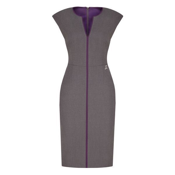 A simple and at the same time original dress will be appropriate for office work, business meetings, negotiations, attending cultural events and meetings with friends. Despite its restraint, it is devoid of emphasized conservative austerity thanks to the original neckline with purple edging and the same color longitudinal stripe from the neckline along its entire length. The combination of colors, elegant silhouette, original details make the outfit extremely attractive!